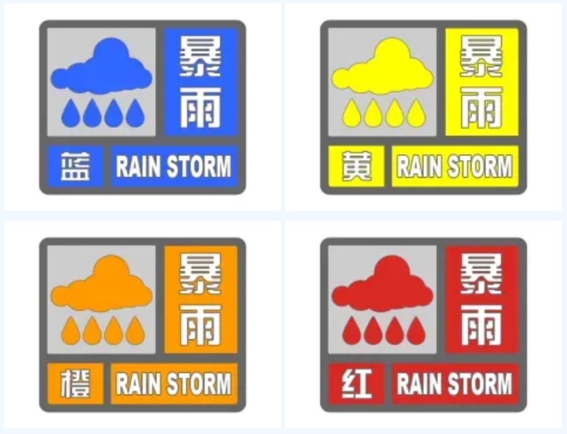 中国气象上规定,24小时降水量为50毫米或以上的雨称为“暴雨”。按其降水强度大小又分为三个等级,即24小时降水量为50~99.9毫米称“暴雨”;100~250毫米之间为“大暴雨”;250毫米以上称“特大暴雨”。暴雨预警信号的等级分为四个等级,Ⅳ级(一般)、Ⅲ级(较重)、Ⅱ级(严重)、Ⅰ级(特别严重),分别用蓝色、黄色、橙色、红色中英文图标标识。