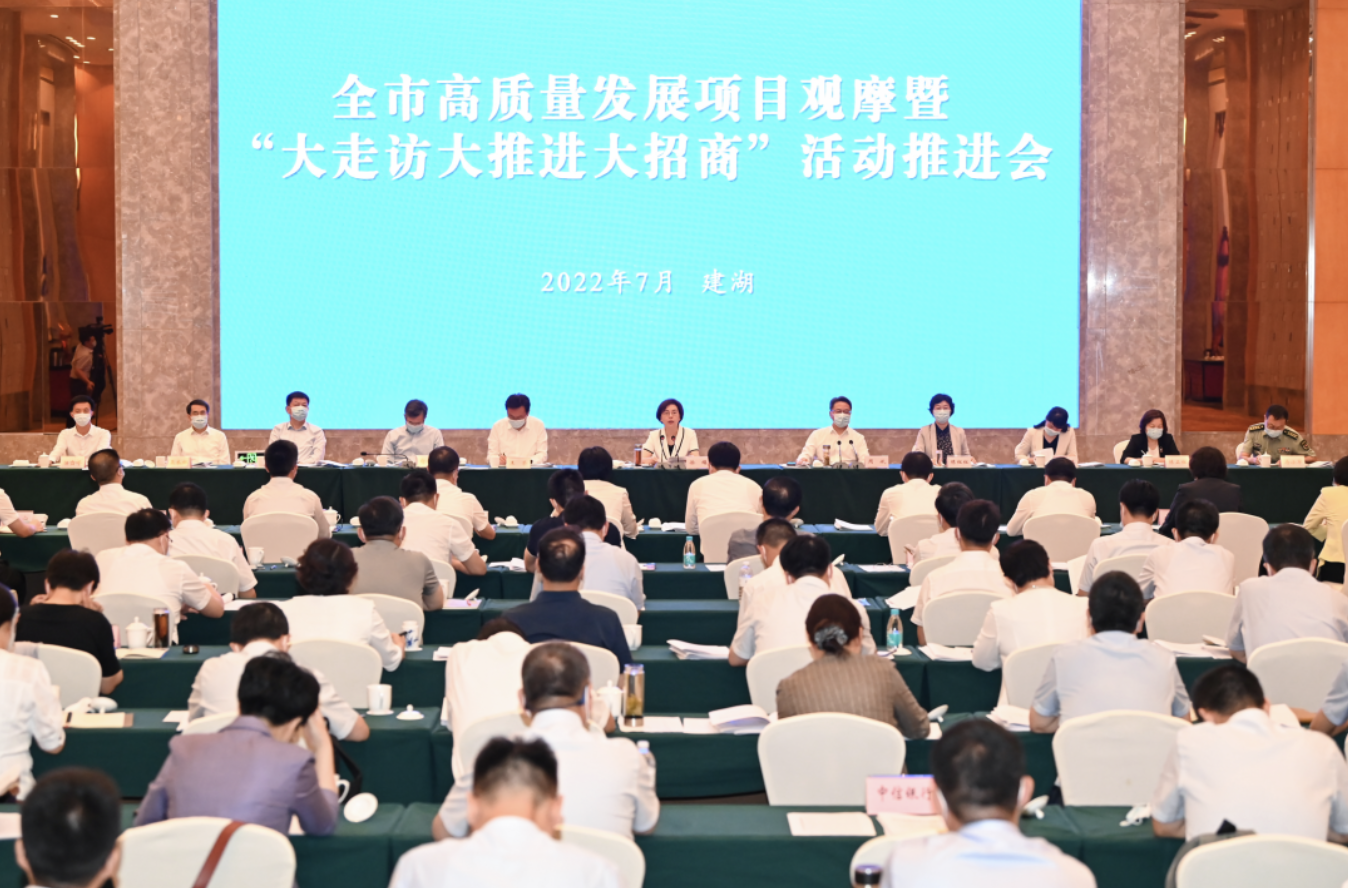 7月27日,我市在建湖县召开全市高质量发展项目观摩暨“大走访大推进大招商”活动推进会。市委书记徐缨主持会议并讲话,强调要坚持以习近平新时代中国特色社会主义思想为指导,认真贯彻落实党中央“疫情要防住、经济要稳住、发展要安全”的重大要求和省委常委会会议精神,扎实开展“企业大走访、项目大推进、产业大招商”活动,全力跑出加速度、拼出新业绩,以项目大突破、产业大发展巩固上半年来之不易的良好发展态势,着力推动全市经济稳健增长,为勇当沿海地区高质量发展排头兵奠定坚实基础。市委副书记、市长周斌对做好当前经济工作作部署。市人大常委会主任王荣、市政协主席陈红红等出席。