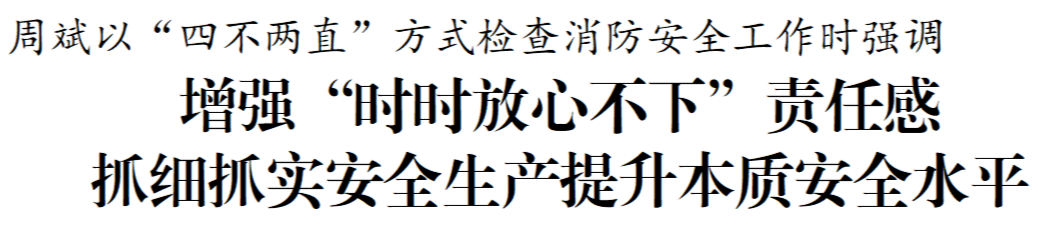 6月27日下午,市委书记周斌以“四不两直”方式检查消防安全工作。他强调,要深入学习贯彻习近平总书记关于安全生产和消防工作的重要论述,按照省市委部署要求,时刻绷紧安全生产这根弦,增强“时时放心不下”的责任感和“事事心中有底”的行动力,抓实抓细隐患排查整治,压紧压实各方责任,全面筑牢安全防线,切实维护人民群众生命财产安全。