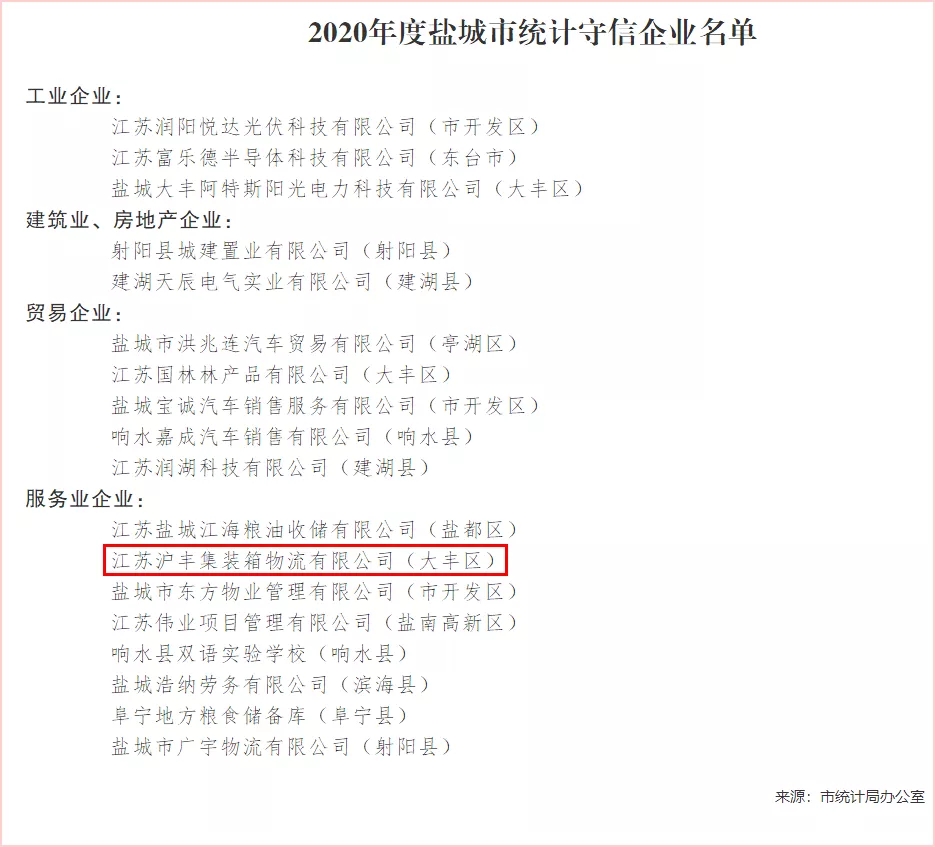 近日,通过严格审核,盐城港沪丰集装箱公司被盐城市统计局评为“2020年度统计守信企业”,充分体现了沪丰公司重视和加强诚信管理体系建设所作出的努力,对塑造公司诚信经营形象、提升物流市场竞争力具有重要意义。