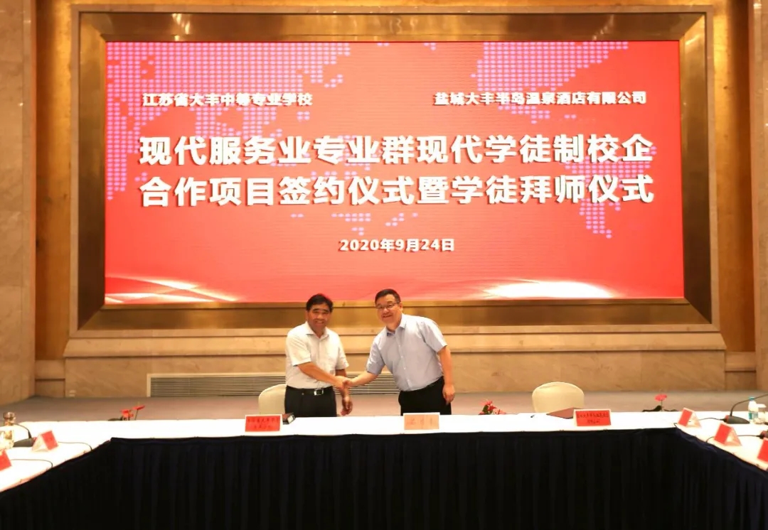 据悉,大丰中等专业学校和大丰港集团旗下半岛温泉酒店签订协议,双方将共同探索建立校企“联合招生、联合培养、定向就业”的人才培养长效机制,为创新人才培养方式提供了一个崭新平台。通过合作,学校和企业进行优势互补,实现资源共享。活动中,学校、酒店、家长、学生四方代表签订了现代学徒制工学交替跟岗实习协议,并举行首批学徒制拜师仪式,23名学生顺利拜师跟岗。
