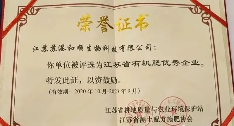 江苏苏港和顺生物科技有限公司将以“江苏省有机肥料优秀企业”殊荣的获得为新的起点,进一步打造品牌,加强现代化企业管理,外塑形象,内强素质,不断提高产品质量与科技水平,为全省农业绿色发展作出新的更大贡献。