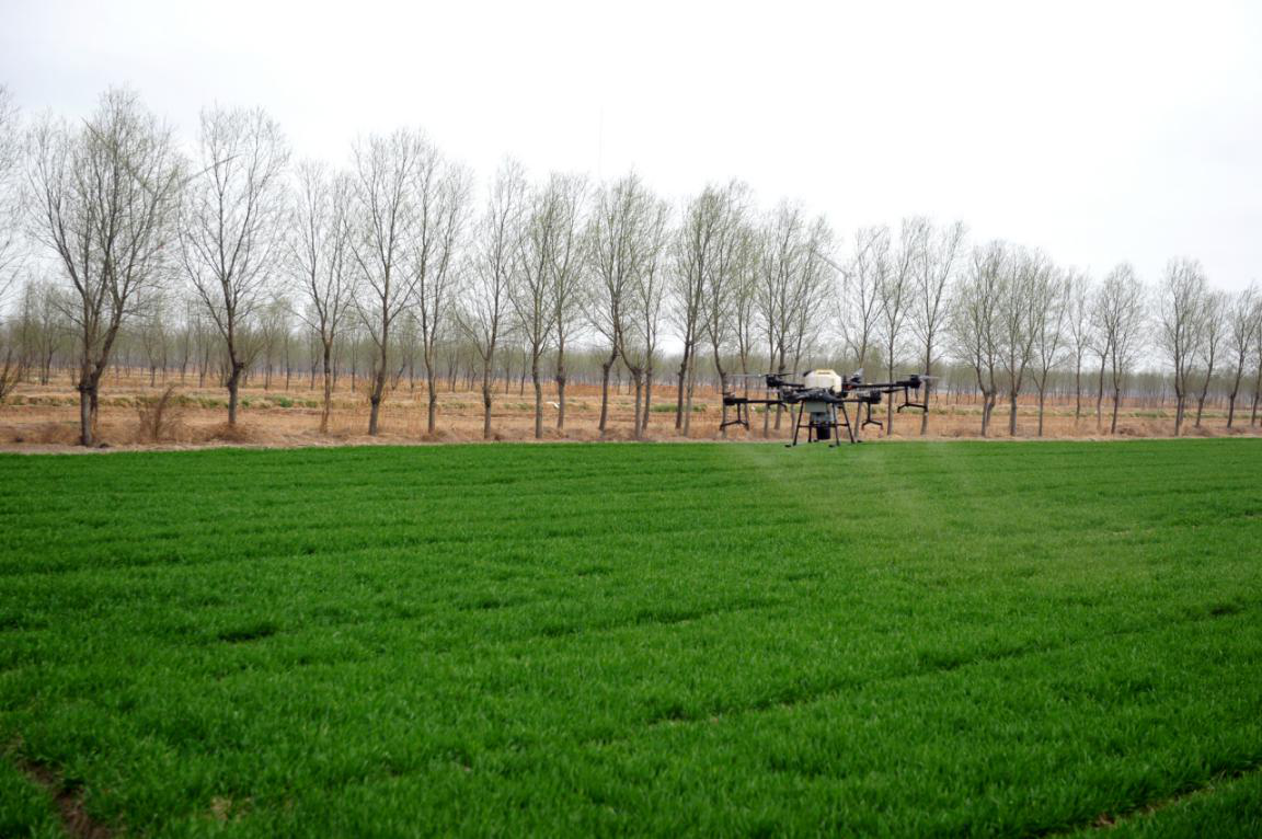 在田间的一头,华丰公司的植保无人机“飞手”正在进行“飞防”作业,确保了农田生产安全,相比传统人工打药防治,每亩地的劳动力、药品成本可降低45%。