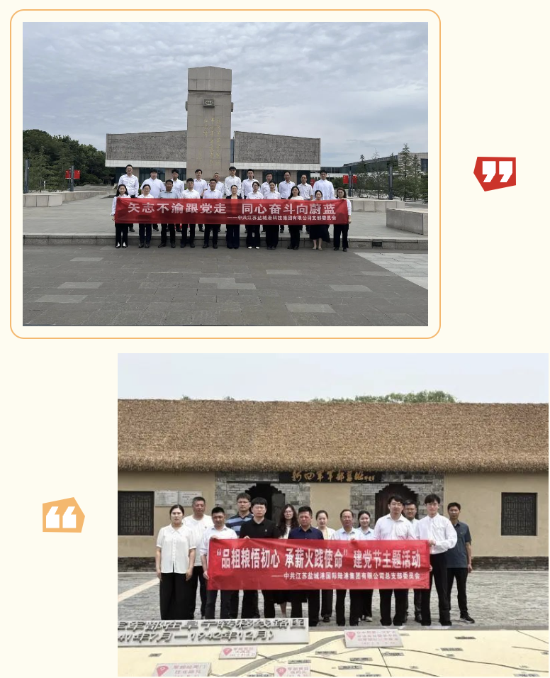 时代见证奋进脚步,征程谱写崭新篇章。在中国共产党成立 104周年之际,盐城港集团各基层党组织深入学习贯彻习近平新时代中国特色社会主义思想,以党建领航为统领,精心组织开展了“重温誓词守初心”“政治生日强党性”“警示教育筑防线”“红联共建聚合力”“志愿服务暖民心”等系列主题活动,赓续红色血脉,凝聚奋进力量,为集团高质量发展注入强劲红色动能。