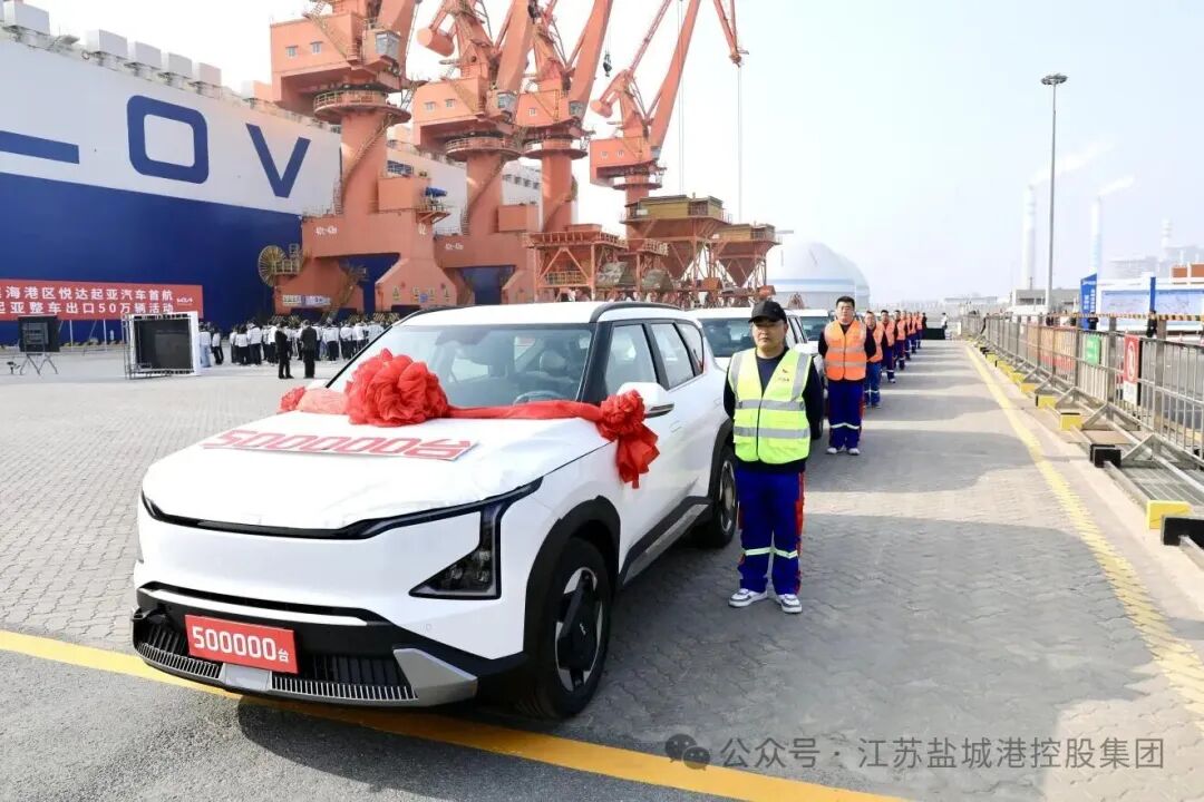 11月15日,在盐城港滨海港区滚装码头,随着2000辆悦达起亚整车平稳驶入滚装船,该品牌在中国整车出口正式突破50万辆大关,盐城汽车出口业务迈上全新台阶。