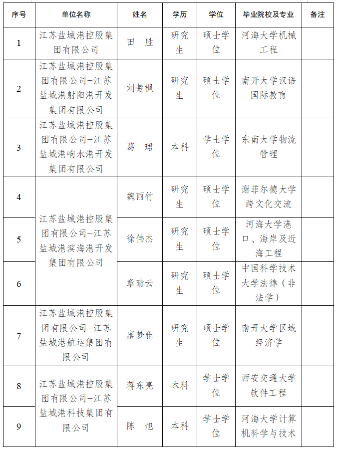 根据江苏盐城港控股集团有限公司相关程序规定,现对9名拟录用人员进行公示。