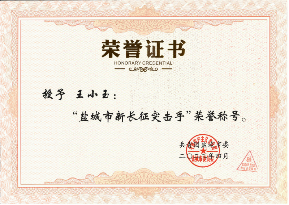 近日,共青团盐城市委发布关于表彰“盐城市两红两优”及“盐城市新长征突击手”的决定,集团王叶娜、陈诗语、王小玉三名同志分别荣获“盐城市优秀共青团干部”“盐城市优秀共青团员”“盐城市新长征突击手”荣誉称号。